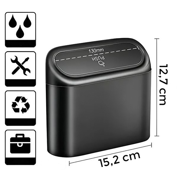 Acest coș de gunoi compact vă menține vehiculul curat și organizat fără a ocupa prea mult spațiu. Designul său oferă o capacitate mare pentru deșeurile zilnice, făcându-l practic și discret.