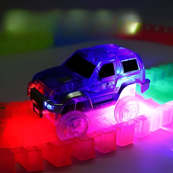 Privește pista și mașina cum luminează în întuneric, creând un spectacol hipnotizant care îmbunătățește experiența de joc.